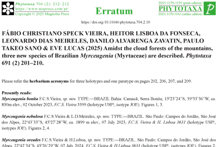 Erratum: FÁBIO CHRISTIANO SPECK VIEIRA, HEITOR LISBOA DA FONSECA, LEONARDO DIAS MEIRELES, DANILO ALVARENGA ZAVATIN, PAULO TAKEO SANO & EVE LUCAS (2025) Amidst the cloud forests of the mountains, three new species of Brazilian